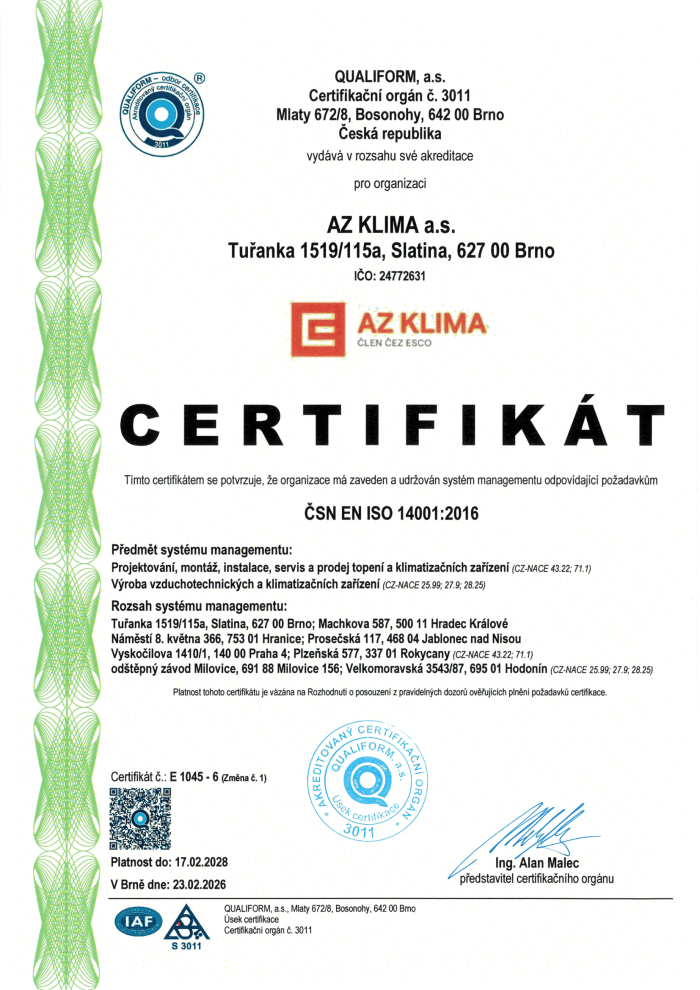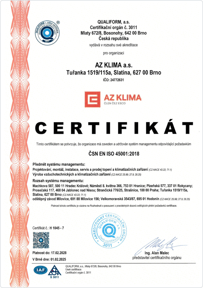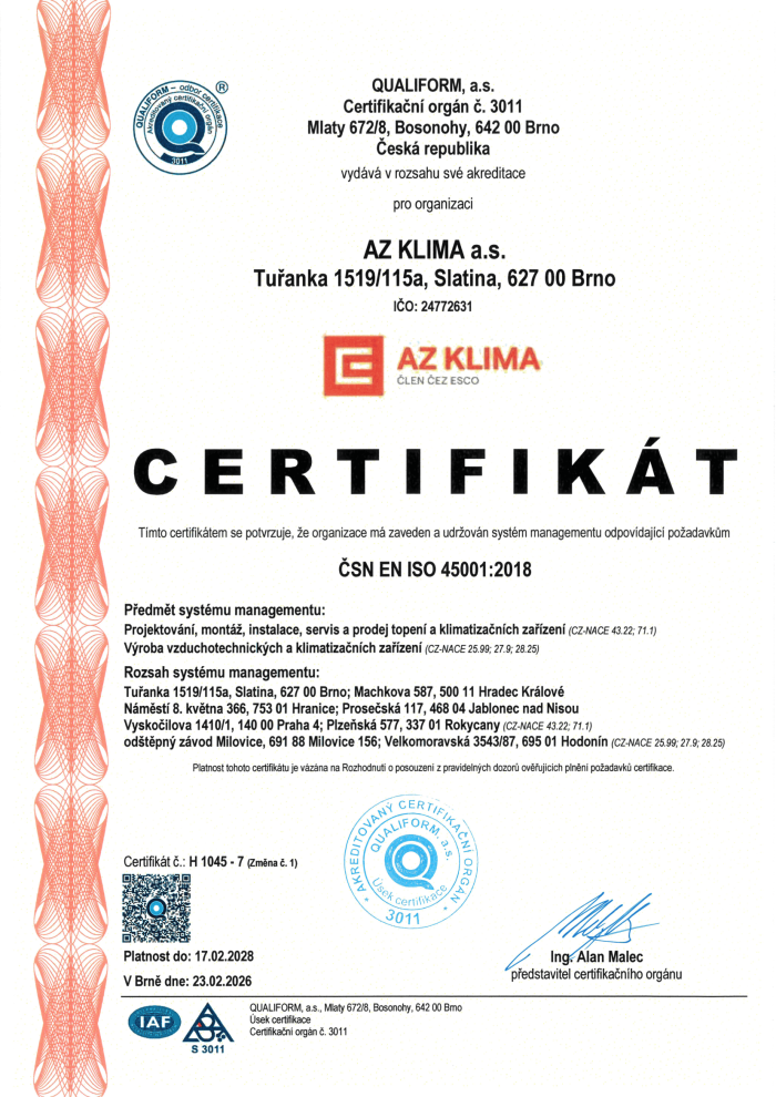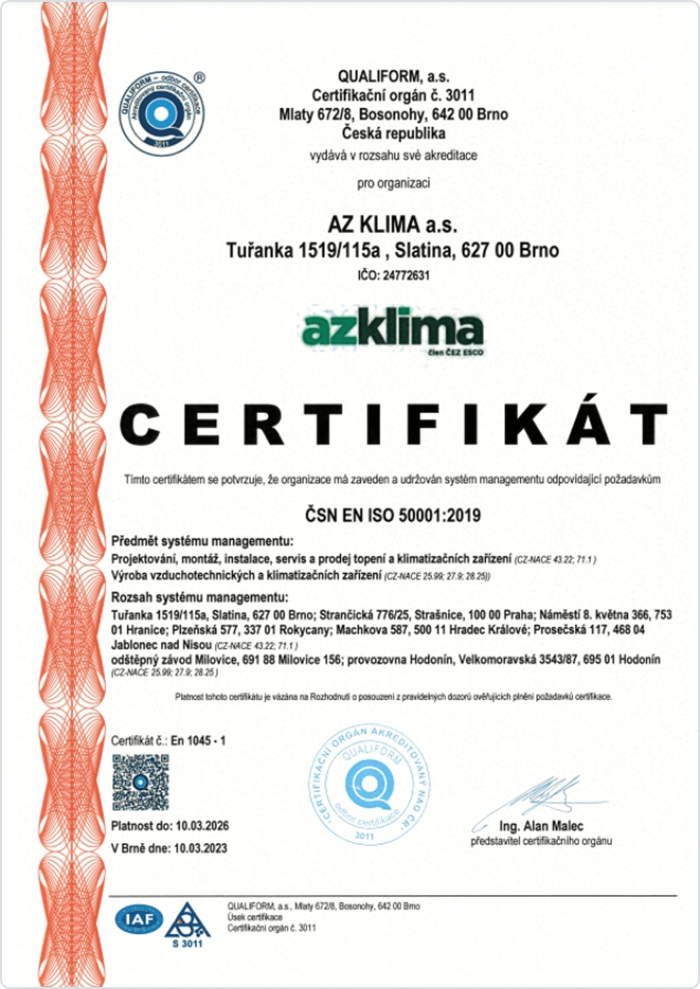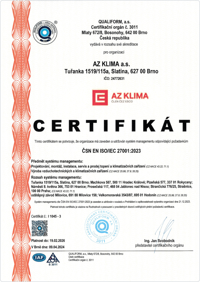 Společnost AZ KLIMA a.s. má zaveden a certifikován systém integrovaného managementu (IMS).