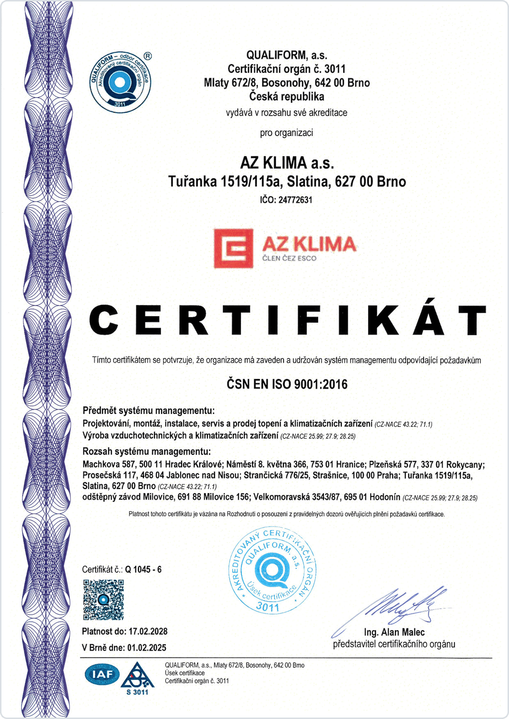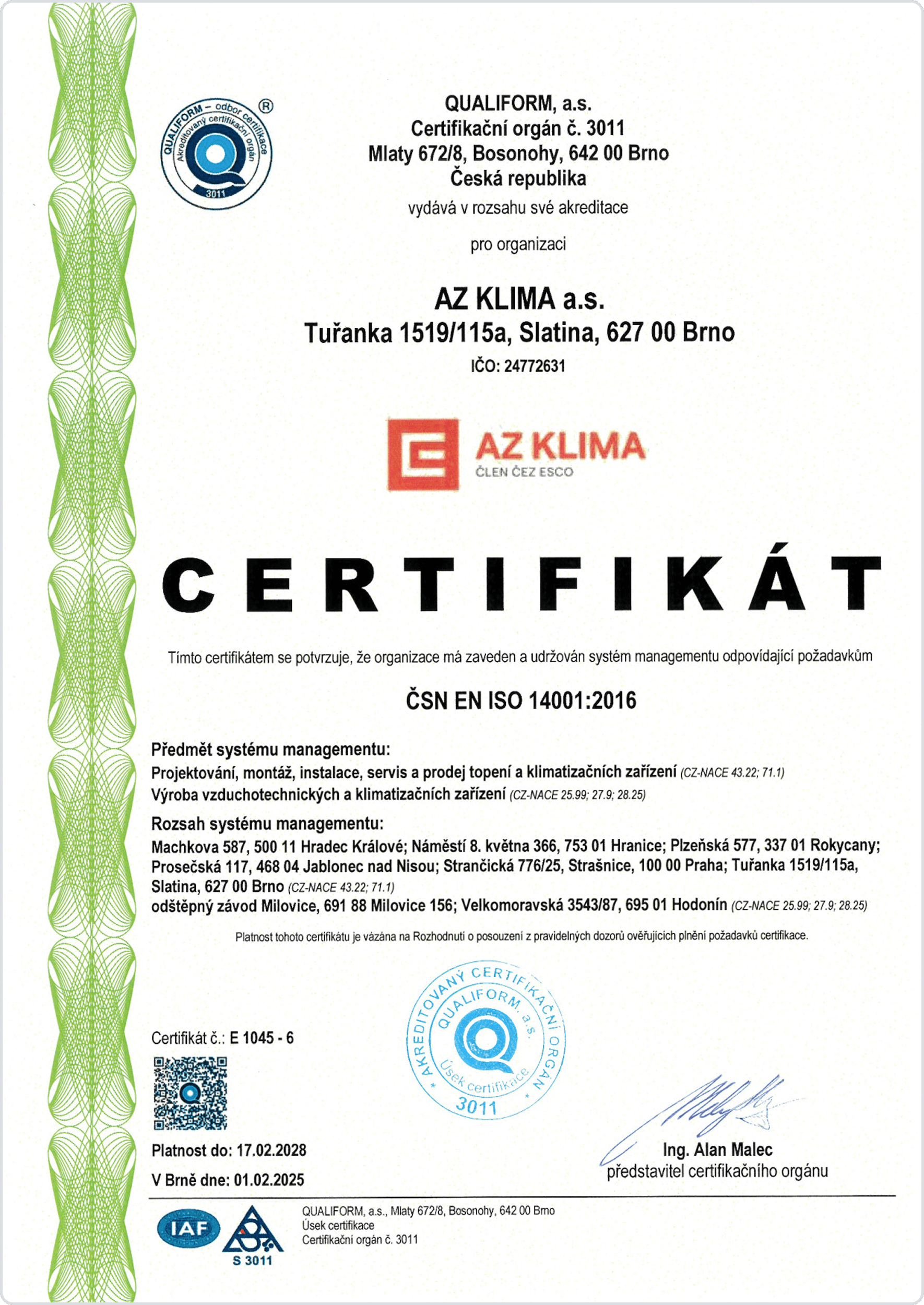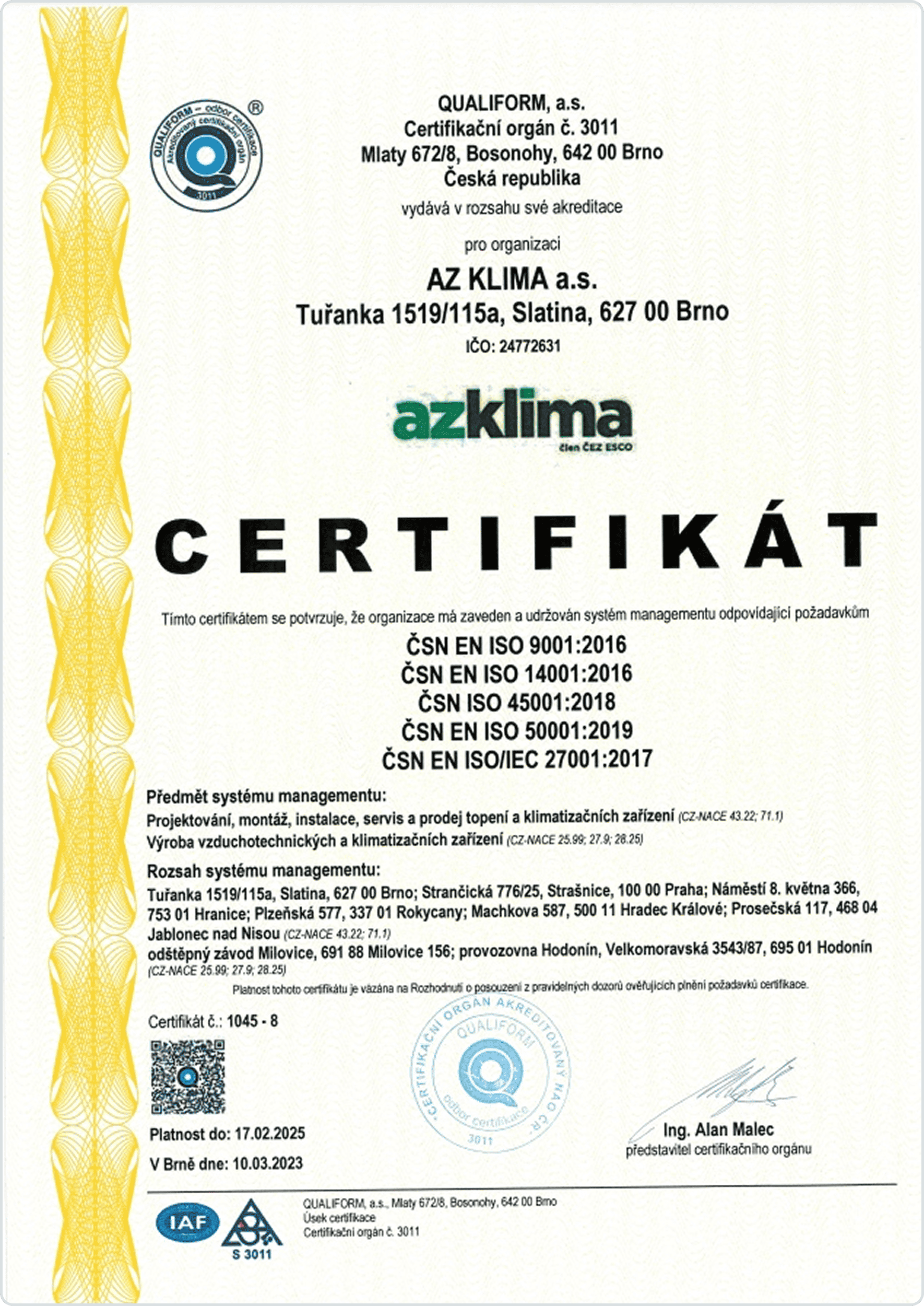 Společnost AZ KLIMA a.s. má zaveden a certifikován systém integrovaného managementu (IMS).